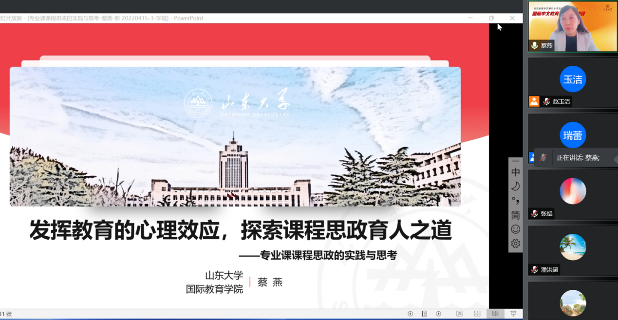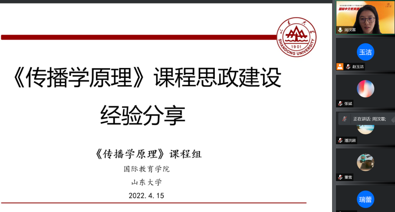 4月15日下午,英国365集团举办第五十三期教学学术线上工作坊,主题为“国际中文教育课程思政建设”。本次工作坊邀请山东省课程思政建设示范课程《传播学原理》主讲教师周汶霏和矫雅楠、《教育心理学》课程负责人蔡燕进行经验分享。院长马晓乐,副院长王尧美、王彦伟、杜文倩以及学院全体教师参加本次工作坊。汉语国际教育系主任朱瑞蕾主持本次活动。