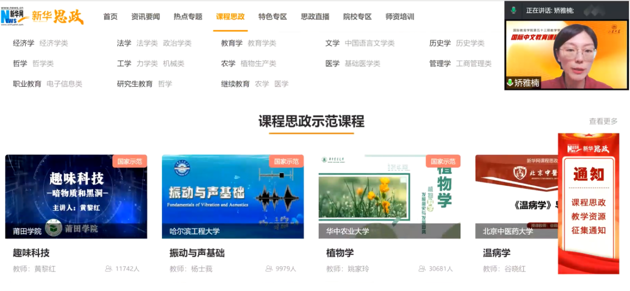 《传播学原理》课程组从相关背景和案例设计两方面对课程思政建设经验进行分享。周汶霏对中共中央办公厅、国务院办公厅发布的《关于深化新时代学校思想政治理论课改革创新的若干意见》和教育部《高等学校课程思政建设指导纲要》进行解读,强调学习中央政策文件的必要性和重要性,在“新文科”和“中文+”学科建设背景下,教师应深入理解思政课程和课程思政同向同行的关系,领会《纲要》中各学科门类课程思政建设的指导思想,从而对课程思政建设方向有更精准的把握,将专业课程和课程思政有机融合,实现“如盐入水、润物无声”的育人效果。在案例设计分析中,周汶霏和矫雅楠分别以《传播学之父——施拉姆》和《把关人理论》的教学设计为例,介绍了其团队在课程思政建设过程中先明确目标、确立切入点,再凝聚共识进行教学设计,坚持将课程思政融入每一个教学步骤的实践。矫雅楠提到,课程思政应当从国际中文教育的专业特色和育人目标入手,培养学生从事汉语国际教育的使命感与职业担当意识,提升学生的专业素养和讲好中国故事的能力,帮助学生立足中国根基,拓展国际视野,提升文化自信。此外,她还介绍了新华思政、人民课程思政、学习强国等课程思政建设资源平台。
